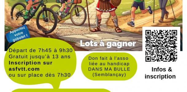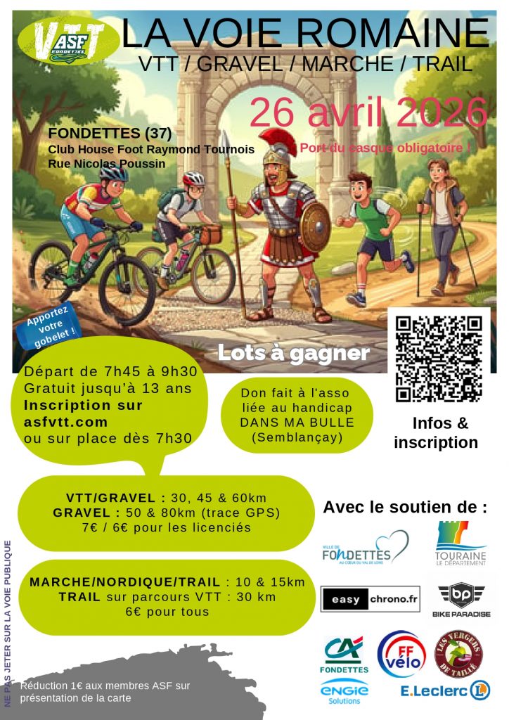 La section VTT organise le dimanche 26 avril 2026 « La Voie Romaine » à Fondettes, avec un départ au club-house Raymond Tournois, rue Nicolas Poussin.