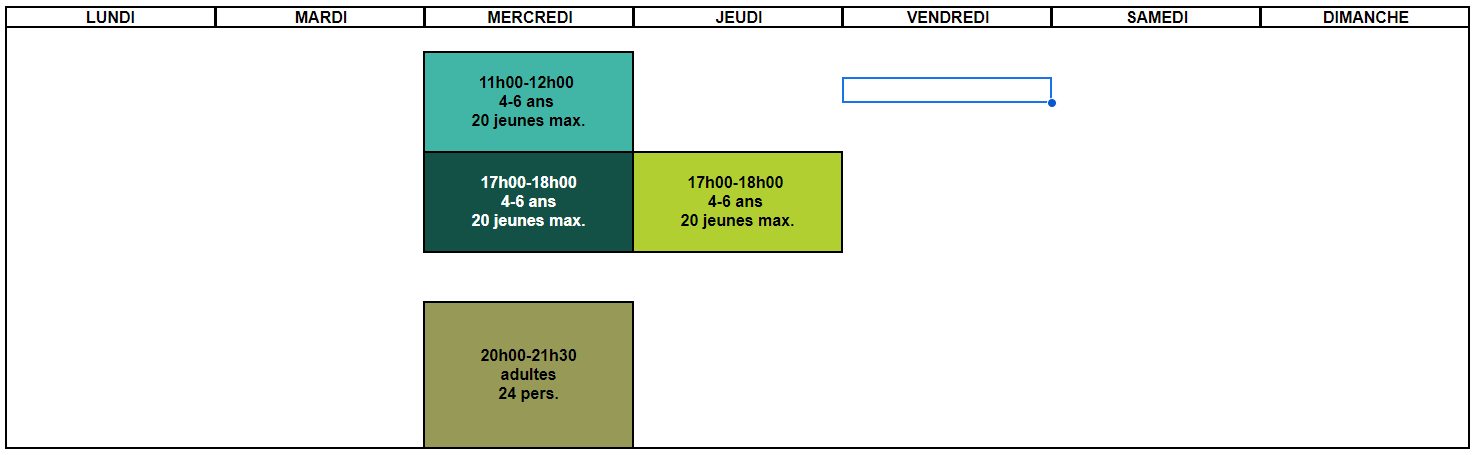 Activités sous forme de cycles de 6 à 7 séances entre chaque vacance scolaire.