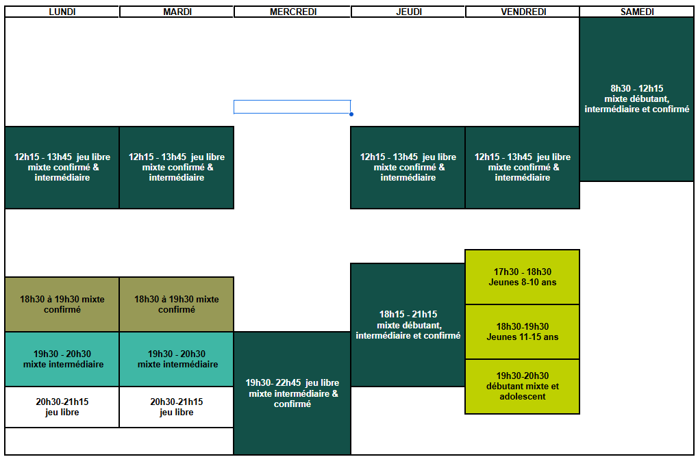 Les créneaux de jeu sont répartis du lundi midi au samedi matin en fonction des niveaux. Nous bénéficions pour certains de ces créneaux de la présence d’un entraîneur diplômé.